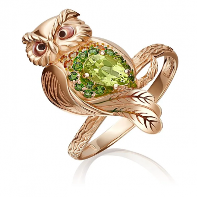 первая страница > Ювелирные изделия > PLATINA Кольцо "Сова" из красного золота 585 пробы c хризолитом, цитринами, хромдиопсидами
