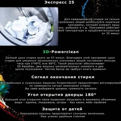 Стиральная машина Kuppersbusch W 20.0 W белаяПрограммы/дополнительные программы:Программы стирки от 20 до 90°C (2 нагревательных элемента) Программы экспресс-стирки на любой температуре длительностью от 20 минут Стандартные программыХлопок, Хлопок 3D-Powerclean, Легкий уход, Ручная стирка, Шерсть, Шелк, Тонкое белье, Смешанная стирка, Быстрая стирка 15 минут, Сорочки/Блузки, Разглаживание, Спортивная одежда, Джинсы, Шторы, Пропитка, Детское белье, Автоочистка (Программа очистки машины)Программы ECO Хлопок, Легкий уходДополнительные функцииЭкспресс, Предварительная стирка (пятна), Уменьшение температуры, Скорость отжима, Остановка полоскания, Замачивание3D стирка - это возможно !Особенности оснащения: Большой цветной дисплей 4.3“Ребра барабана для 3D-Стирки (технологии 3D-Washing)Шумоизоляция: Silent PlusСветодиодная подсветка барабанаДатчик регулирования загрузкиИндикация хода программы и времени до окончания программыОтложенный запуск – до 7 днейИндивидуальные настройки: например, дополнительный цикл полосканияРегулируемый по интенсивности акустический сигнал окончания программыБак из нержавеющей сталиУгол открывания люка – 180°, диаметр люка – 34 смВозможность перенавески люка (правая/левая)Хромированный люкЗащита от детей, двойное стекло люкаСистема защиты от протечки Aquastop / Контроль пенообразованияКомпенсация дисбалансаИндикация подачи / слива водыОбзор специальных программУличная и спортивная одеждаЭта группа программ подходят для стирки одежды для различных погодных условий, курток для спорта и отдыха, а также современных тканей из микрофибры или с высоким содержанием микрофибры, например, GoreTex или SympaTexУход за домомПрограммы группы «Уход за домом», для которых используется большой объем воды и низкая скорость отжима, хорошо подходят для стирки изделий бытового назначения из смешанного типа ткани и синтетикиОдежда для бизнесаНемнущиеся рубашки и блузки, как правило, можно не гладитьАнтибактериальная обработкаПрограммы группы «Антибактериальная обработка» позволяют уничтожить большинство вредных для здоровья микроорганизмов и клещей , а также эффективно вымывать аллергены из тканейОбзор дополнительных программЭкспрессДанная дополнительная программа предназначена для бережной стирки слегка загрязненного белья. Снижает потребление электроэнергии и продолжительность программы стиркиПредварительная стиркаДля особо загрязненной одежды, сложных пятен (кровь, пятна от белка и пр.), а также для рабочей одежды.Температура стирки: 30 °CИнтенсивная стиркаПрограмма предназначена для сильно загрязненного белья, особенно с пятнами, которые необходимо отбеливать (например, от фруктов, кофе, чая, красного вина, масла). Длительность цикла стирки увеличиваетсяТемператураТемпературу стирки можно поэтапно уменьшать с шагом 10 °C. Текущая температура отображается на дисплееСкорость отжимаУменьшение скорости отжима обеспечивается бережное отношение к деликатному белью. Текущая скорость отжима отображается на дисплееОстановка полоскания (режим «Без отжима»)Дополнительная программа остановки полоскания позволяет избежать образования складок на деликатном белье, оставив его в последней воде для полосканияЗамачиваниеПосле нажатия кнопки запуска программы начинается отсчет времени замачивания; оставшееся время до запуска прог